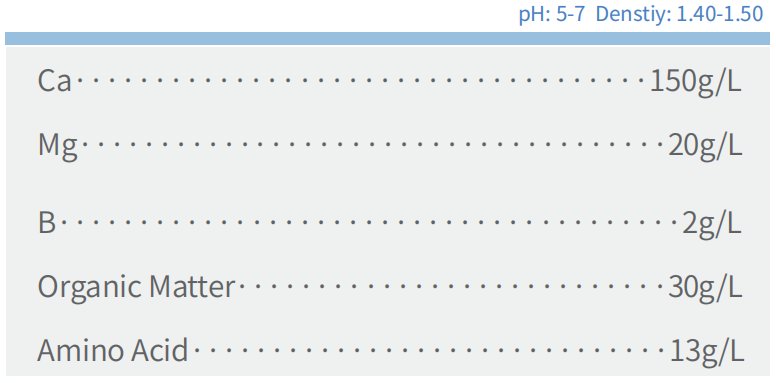 Enzymatically degraded fish protein combined with Calcium, Magnesium, Boron, providing crop with free amino acid and chelated mineral elements. Improve crops uptake rate of nutrients and increase fruits quality.